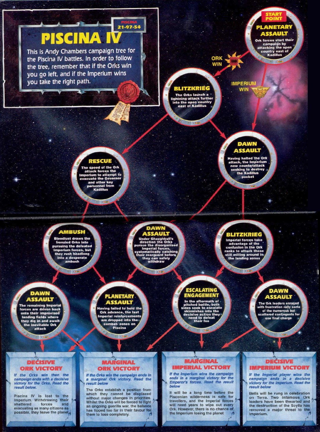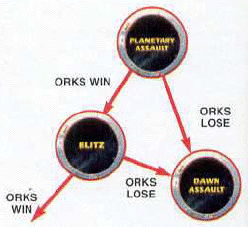 If the Orks were defeated in the Planetary Assault the Imperial forces around Kadillus would be able to launch a full-blown Dawn Assault to try to eradicate the Orks there. We also decided that this would be the likely result if the Ork blitz was stopped. This gave us a start to the tree which looked like this.