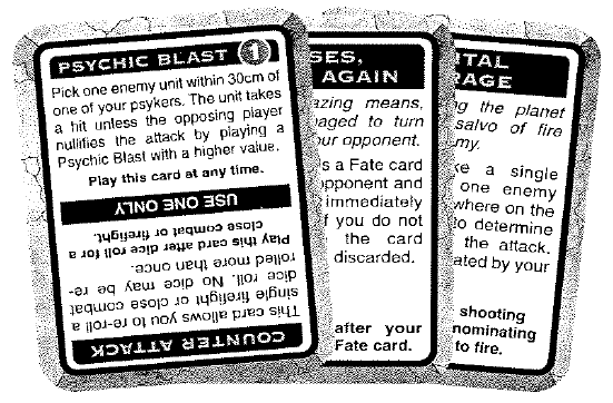 The unpredictable tides of battle are represented in Epic Warhammer 40,000 by a deck of Fate cards. Each card represents an unusual event or circumstance which might crop up to help your army or hinder the enemy during a battle. Using Fate cards is optional and is not restricted to particular scenarios (which is why they are not in the Scenario Special rules). However, we highly recommend them as a way of adding extra spice to a game, and flattening out some of the wilder rolls that can occur in firefights and close combats. If psykers are being used by either side Fate cards should definitely be used as the psykers' powerful attacks are represented by playing Fate cards.